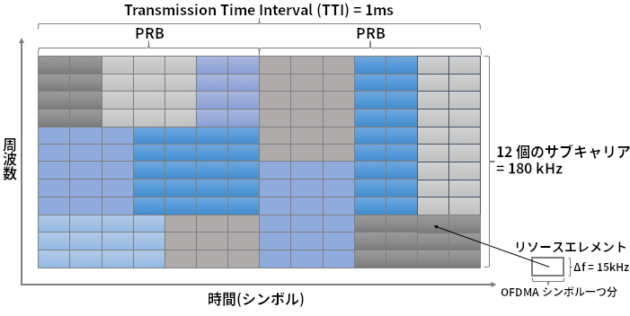 OFDMA を使うとき、電波スペクトルは図 54 のように二次元のリソースとして自然に表せる。スケジュール可能な最小単位は RE (Resource Element) と呼ばれ、15 KHz 幅のサブキャリア周波数帯で一つの OFDMA シンボルを送信することに対応する。一つのシンボルに符号化できるビット数は変調レートによって異なる。例えば QAM (Quadrature Amplitude Modulation, 直角位相振幅変調) では、16-QAM ならシンボルにつき 4 ビット、64-QAM ならシンボルごとに 6 ビットが符号化される。