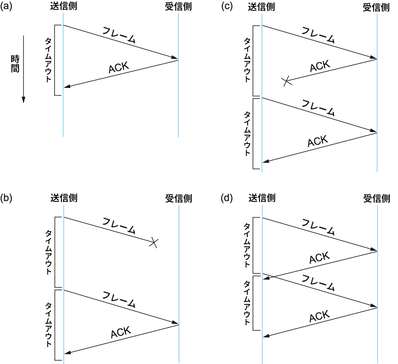 この単純なアルゴリズムで発生する可能性のある四つの異なるシナリオのタイムラインを図 34 に示す。送信側が左に、受信側が右に示され、時間は上から下に向かって流れる。(a) ではタイムアウトの制限時間内に ACK が届き、(b) と (c) ではそれぞれフレームと ACK が喪失し、(d) ではタイムアウトが ACK の到着よりも早く発生する。ここで「喪失する」とは、フレームが転送中に破損し、その破損が受信側の誤り検出符号で検出され、最終的にフレームが破棄されることを意味する。