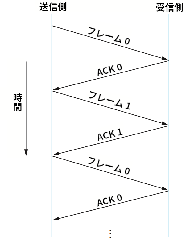 ストップアンドウェイトアルゴリズムには細かな工夫が必要となる重要な点が一つある。送信されたフレームに対して受信側が送り返した確認応答が喪失または遅延した状況を考えよう。これは図 34 の (c) または (d) に対応する。両方のケースにおいて、送信側はタイムアウトと判断してフレームを再送する。しかし受信側はそのフレームを既に受け取って確認応答も送信しているので、再送されたフレームを次のフレームとみなしてしまう。そのため何もしないと、重複するフレームが転送される可能性がある。この問題を解決するために、ストップアンドウェイトアルゴリズムを使うプロトコルの多くはヘッダーに 1 ビットのシーケンス番号 ── 0 か 1 の値を取るフレーム識別用の数値 ── を用意して、フレームごとに 0 と 1 を交互に使用する。この様子を図 35 に示す。例えば送信側がフレーム 0 を再送するときは、受信側はそれがフレーム 0 の二つ目のコピーであり、フレーム 1 の一つ目のコピーではないと判断できるので、既に受け取っている場合 (ACK が喪失した場合) には無視できる。
