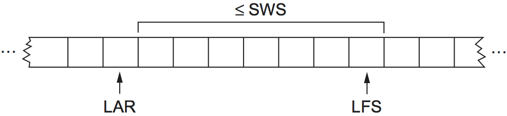 SWS: 一度に送信して処理中 (確認応答待ち) にできるフレーム数の最大値を表す (send widnow size)。LAR: 確認応答を受け取ったフレームのシーケンス番号の最大値を表す (last acknowledgment received)。LFS: 送信したフレームのシーケンス番号の最大値を表す (last frame sent)。