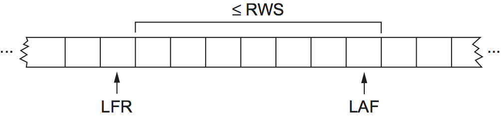 RWS: 順番が前後した場合でも受け取ることができるフレーム数の最大値を表す (receive window size)。LAF: 受け取ることができるフレームのシーケンス番号の最大値を表す (largest acceptable frame)。LFR: 最後に確認応答を送信したフレームのシーケンス番号を表す (last frame received)。