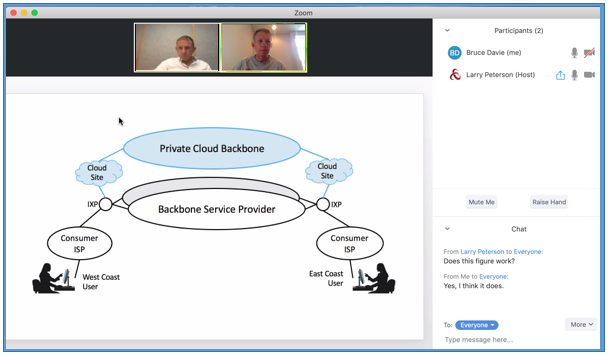 マルチメディアアプリケーション ── 映像、音声、データの通信を利用するアプリケーション ── は、 インタラクティブアプリケーションとストリーミングアプリケーションの二つに大別できる。図 147 に典型的なインタラクティブアプリケーションであるビデオ会議ツールを利用する著者らの様子を示す。VoIP と同様に、インタラクティブアプリケーションは最も厳しいリアルタイム要件が課される種類のアプリケーションである。