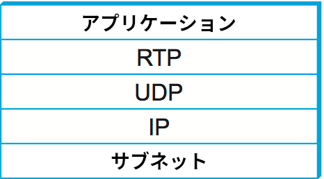 RTP は様々な下位プロトコルの上に実装できるものの、現在でも通常は UDP の上に実装される。このときプロトコルスタックは図 148 のようになる。ここで、トランスポートプロトコルの上にトランスポートプロトコルが積まれていることに注目してほしい。前節 でも触れたように、そうしてはいけないルールは存在しない。それどころか、UDP はポート番号ベースの簡単な逆多重化という RTP がスタート地点として必要とする機能をたまたま提供するので、それ以外の機能が最小限の UDP を採用するのは理にかなった判断と言える。つまり、RTP はポート番号を一から自作することなく、逆多重化の機能を UDP にアウトソースしている。
