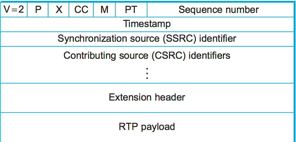 図 149 に RTP ヘッダーのフォーマットを示す。最初の 12 バイトは必ず存在し、次の CSRC (contributing source, 貢献送信元) 識別子は特定の状況でのみ使われる。その後には省略可能な拡張ヘッダーが続く (後述)。ヘッダーの後ろには RTP ペイロードがあり、そのフォーマットはアプリケーションによって異なる。このヘッダーには多くの異なるアプリケーションで使われる可能性が高いフィールドだけが含まれている: この裏には「アプリケーション特有の情報はそのアプリケーションでのみ使われる RTP ペイロードを使った方が効率良く伝達できる」という考え方がある。