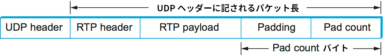 次のビットはパディング (padding, P) ビットであり、何らかの理由で RTP ペイロードにパディングが含まれる場合は 1 に設定される。暗号アルゴリズムからの要請などによって特定のサイズのブロックになるまで RTP ペイロードにパディングが必要になる場合がある。そういった場合には、RTP のヘッダー、ペイロード、パディングを含めた完全な長さが下位層のプロトコル (例えば UDP) のヘッダーに含まれ、RTP パケットの末尾に無視すべきパディングの長さが記される (図 150)。このアプローチによってパディングの有無にかかわらずパケットの長さを表すフィールドが RTP ヘッダーに不必要となる点に注目してほしい。パディングが存在しない通常のケースでも、下位層のプロトコルのヘッダーを見ればパケットの長さを取得できる。