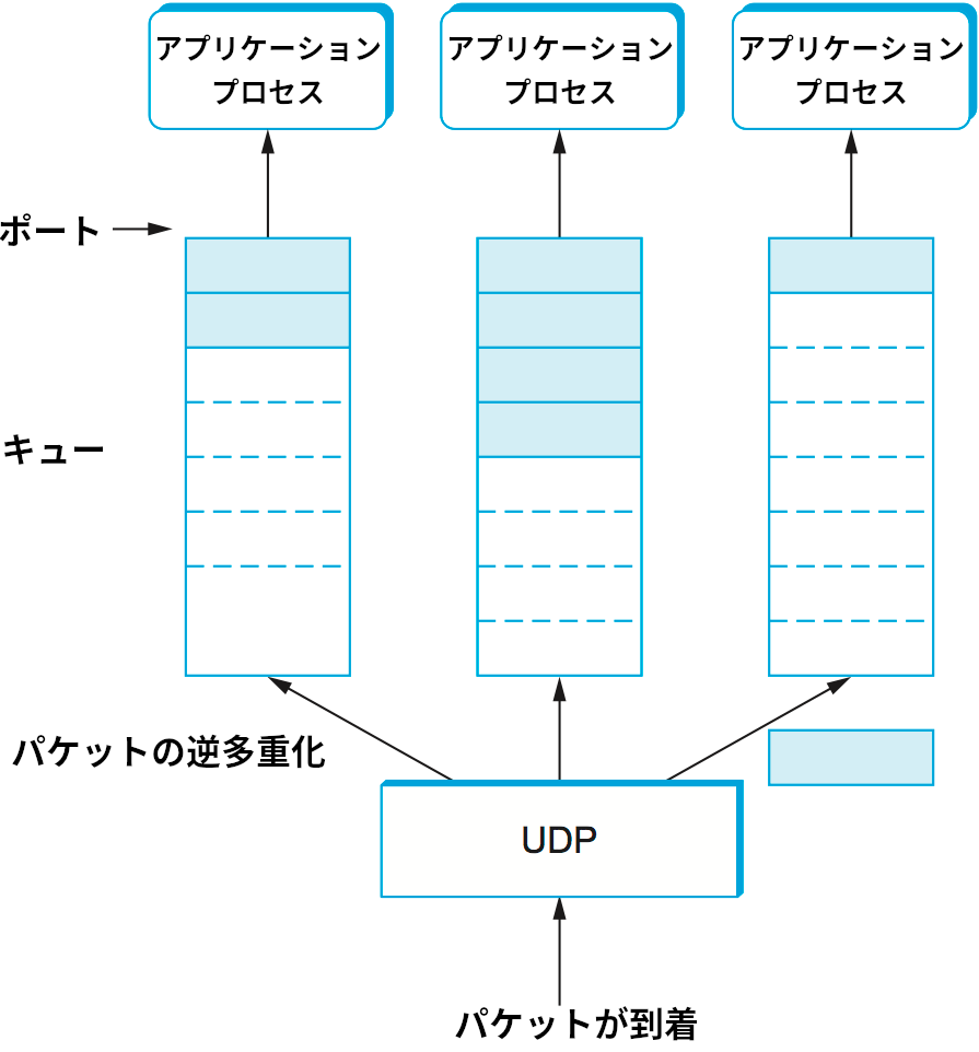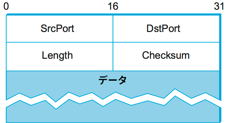 この逆多重化機能を実装するトランスポートプロトコルのヘッダーにはメッセージの送信元 (source) と宛先 (destination) が含まれる。例として 図 125 に UDP ヘッダーを示す。UDP のポートフィールドは長さが 16 ビットしかない点に注目してほしい。これは UDP のポートが最大でも約 65 万個しか存在できないことを意味する。65 万個のポートはインターネットに存在する全てのプロセスを識別するには明らかに足りないものの、幸いポートは単一のホストでのみ解釈されるので問題にならない。つまりプロセスは特定のホストにおけるポートとして識別され、(ポート, ホスト) の組が実際の識別子となる。この組が UDP プロトコルにおける逆多重化鍵の役割を果たす。