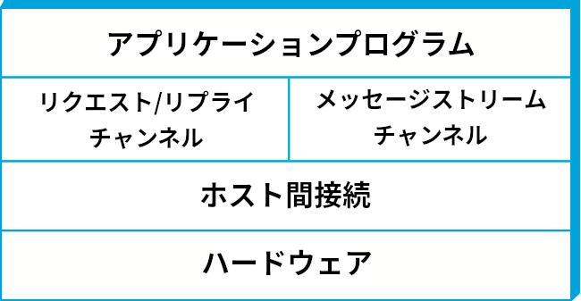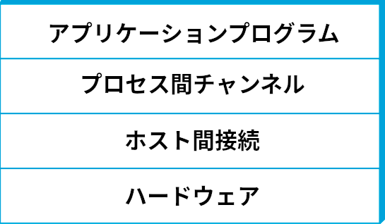 例えば前節における要件の議論で考えたネットワークでは、アプリケーションプログラムと下位のハードウェアの間に抽象化の層が二つ存在すると考えることができる (図 8)。ハードウェアのすぐ上にあるのはホスト間の接続を提供する層であり、どんな複雑なネットワークトポロジーがホスト間に存在したとしても、それを同じように抽象化する。その上にある層は利用可能になったホスト接続サービスを利用してプロセス間のチャンネルを実装する層であり、例えば「ネットワークがたまにメッセージを喪失する」といった事実を隠蔽する。
