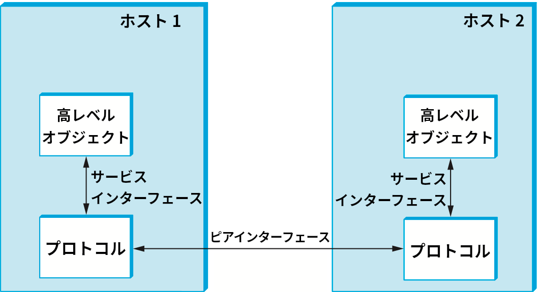 まとめると、プロトコルはローカルに公開される通信サービス (サービスインターフェース) と、そのサービスを実装するためにピアとやり取りするメッセージの規約 (ピアインターフェース) を定義する。この事実を図 10 に示す。