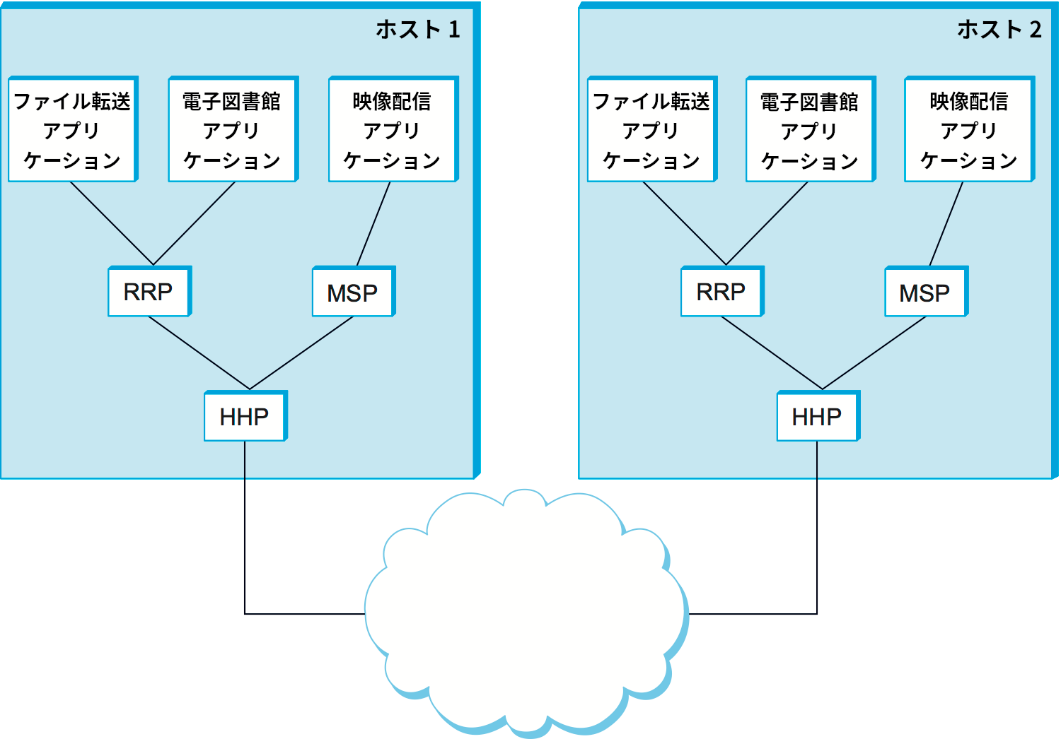この例で、ホスト 1 のファイルアプリケーションが RRP によって提供される通信サービスを使ってホスト 2 のピアにメッセージを送る状況を考えよう。このとき、ファイルアプリケーションは自身の代わりにメッセージを転送してもらうよう RRP に要求する。RRP はピアと通信するために HHP のサービスを起動し、これを受けて HHP のサービスがメッセージをホスト 2 のピアに送信する。メッセージがホスト 2 の HHP インスタンスに到着すると、HHP はメッセージを RRP に受け渡し、RRP はファイルアプリケーションにメッセージを受け渡す。このシナリオにおいて、アプリケーションは RRP と HHP からなるプロトコルスタック (protocol stack) を利用していると言う。