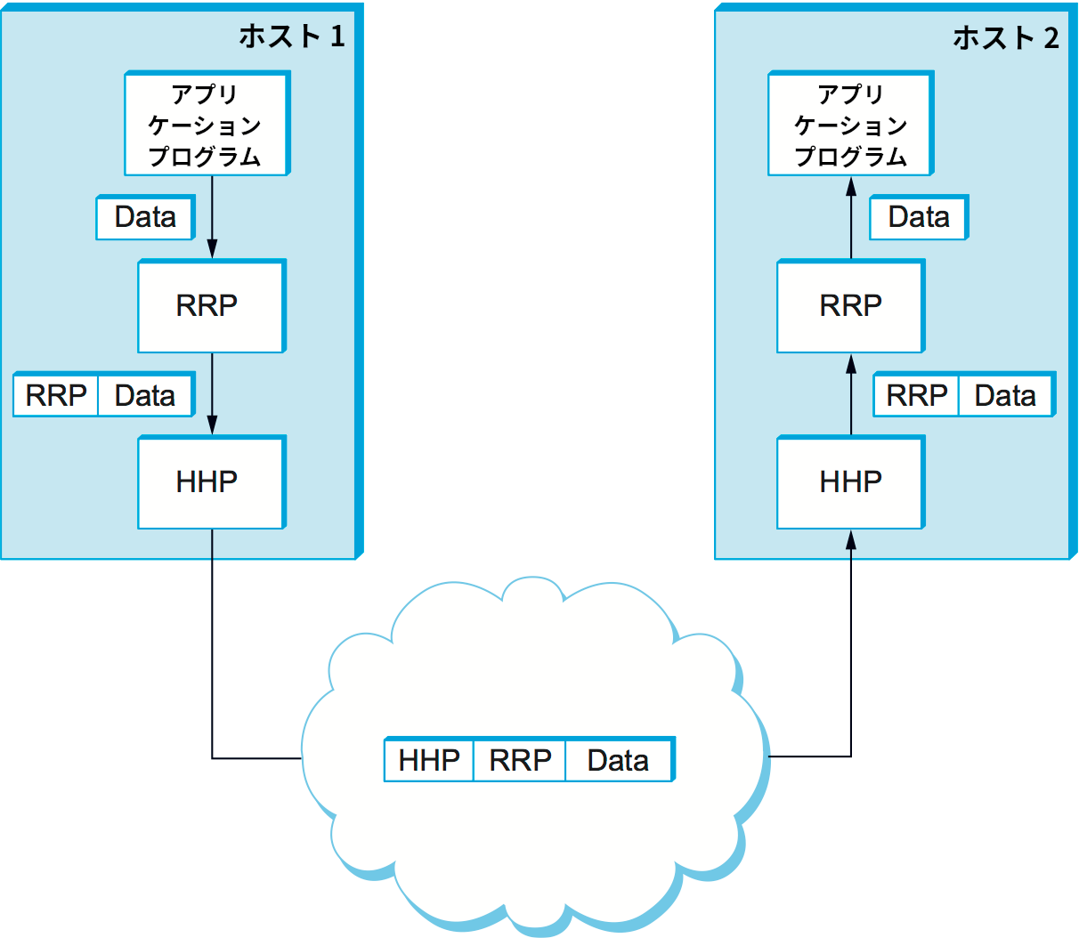 このカプセル化のプロセスはプロトコルグラフの各頂点で繰り返される。例えば HHP は RRP のメッセージに HHP 独自のヘッダーを付けることでそれをカプセル化する。HHP が何らかのネットワークを通してメッセージをピアに届けると仮定すれば、宛先のホストに到着したメッセージには逆の順番で処理が行われる: 最初に HHP がメッセージの最初にある HHP ヘッダーを解釈 (例えばヘッダーの内容に応じて適切な処理を実行) し、メッセージの本体 (HHP ヘッダーを除いた部分) を RRP に渡す。RRP はそのメッセージに含まれる RRP ヘッダーが指示する処理を実行し、本体 (RRP ヘッダーを除いた部分) をアプリケーションプログラムに渡す。ホスト 2 で RRP からアプリケーションプログラムに渡されるこのメッセージは、ホスト 1 でアプリケーションプログラムが RRP に渡したメッセージと完全に一致する。下位の通信サービスの実装のために付けられたヘッダーをアプリケーションプログラムが見ることはない。以上の処理を図 12 に示す。なお、この例でネットワーク内のノード (スイッチやルーター) はメッセージの先頭にある HHP ヘッダーを調べる場合がある。
