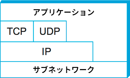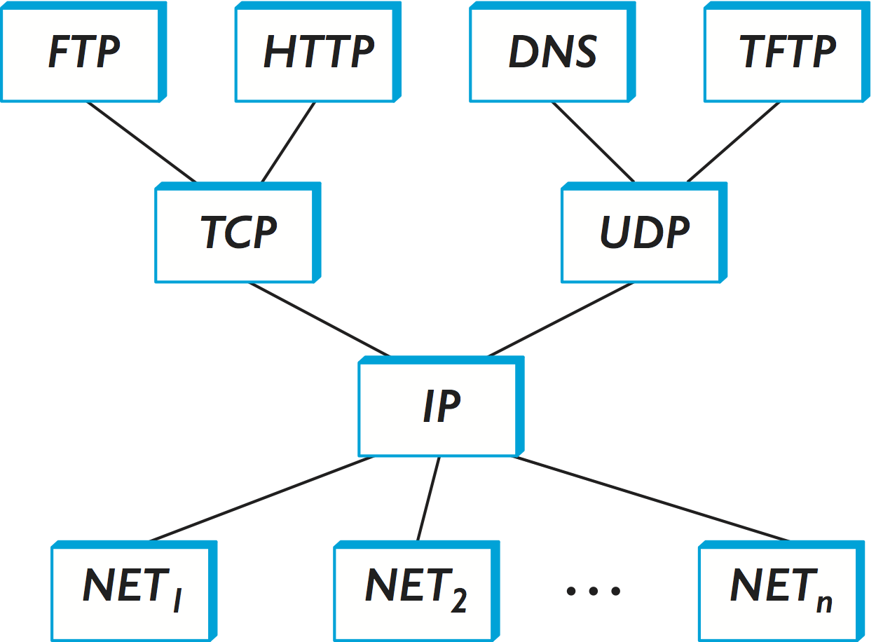 OSI 7 層モデルによるインターネットの説明は (多少解釈を歪めれば) 不可能ではないものの、通常はもっと簡単なスタックが代わりに使われる。図 14 で最下位にあるのは NET1, NET2 といった様々なネットワークプロトコルである。実際には、こういったプロトコルはハードウェア (例えばネットワークアダプター) とソフトウェア (例えばネットワークデバイスドライバ) を組み合わせて実装される。例えば IEEE 802.11 (Wi-Fi) 規格などの無線プロトコルやイーサネットプロトコルがこの層に存在する (これらのプロトコルの中にも層は存在するものの、インターネットアーキテクチャはそういった層に関して何も仮定しない)。次の層には IP (Internet Protocol) が一つだけ存在する。IP は様々なネットワークテクノロジの相互接続を単一の論理的なインターネットワークへと変換する。IP の上には二つの主要なプロトコルが示されている ── TCP (Transmission Control Protocol) と UDP (User Datagram Protocol) である。TCP と UDP はそれぞれ異なる種類の論理チャンネルをアプリケーションプログラムに提供する: TCP は信頼性のあるバイトストリームチャンネルを、UDP は信頼性のないデータグラム (datagram) の転送チャンネルを提供する (ここでデータグラムはメッセージと同じ意味だと考えて構わない)。インターネットの言葉では、TCP と UDP をエンドツーエンドプロトコル (end-to-end protocol) と呼ぶこともある。ただし「トランスポートプロトコル」と呼んだ方が正確ではある。