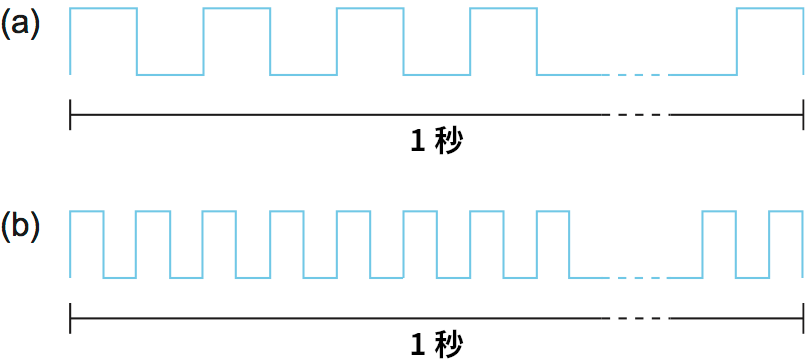 ネットワーク全体の帯域を議論したいこともあれば、もっと細かい部分、例えば単一の物理リンクあるいは論理的プロセス間チャンネルの帯域に注目したい場合もある。物理レベルの帯域は止むことなく向上しており、限界は見えていない。帯域を直感的に説明しよう。1 秒の時間を線分として表すと、帯域はその線分に詰め込めるビット数、各ビットは同じ幅のパルスとして表せる。例えば 1 Mbps リンクの各ビットは 1 μs の幅を持ち、2 Mbps リンクの各ビットは 0.5 μs の幅を持つ (図 16)。データの送受信技術が高度になると各ビットは薄くなり、帯域は増加する。論理的なプロセス間チャンネルの帯域はチャンネルを実装するソフトウェアがデータの各ビットに対して行う処理 (あるいは変形) など、他の要因にも影響を受ける。