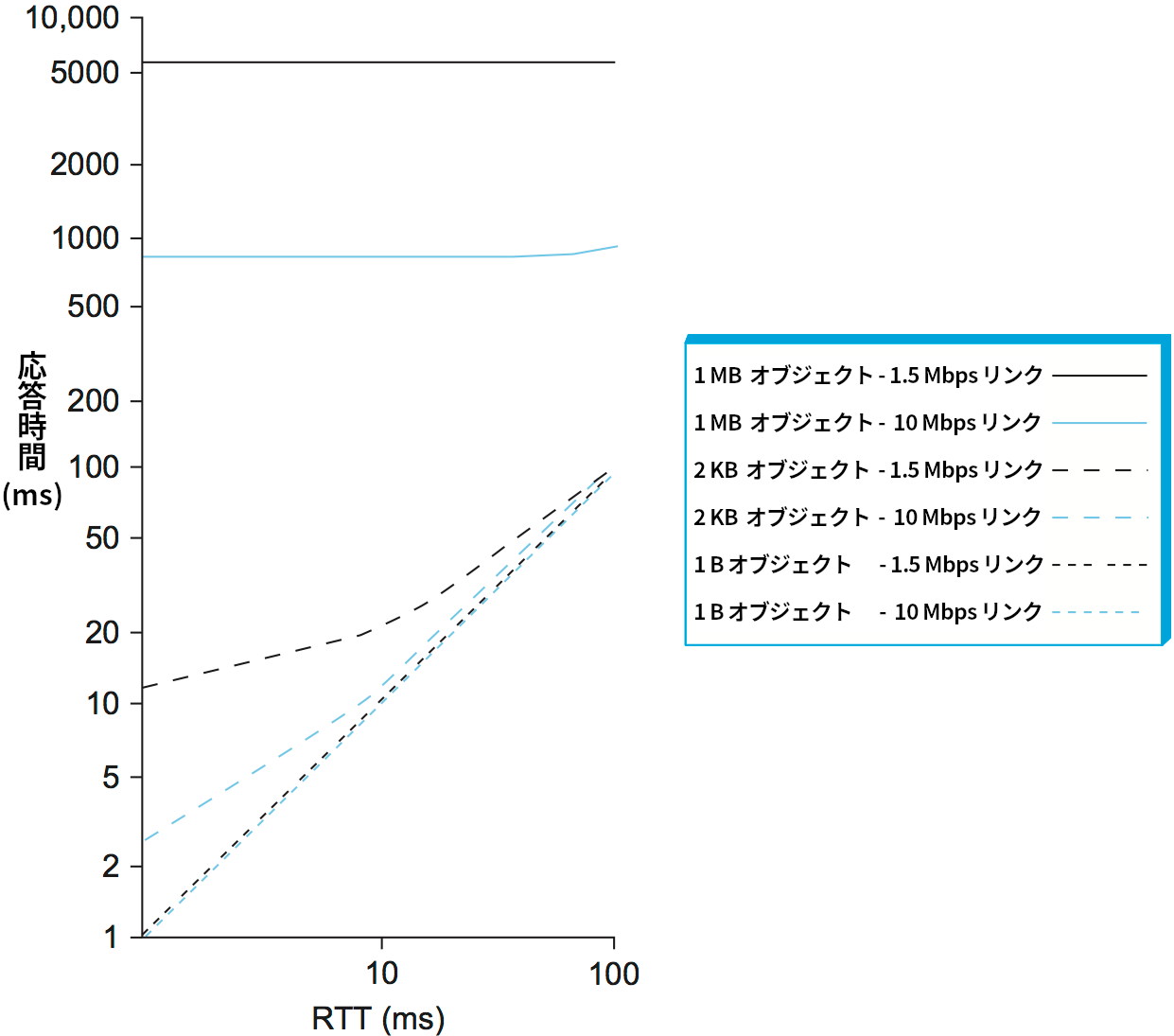 様々な設定でレイテンシと帯域のどちらがパフォーマンスを支配するかを示すグラフを図 17 に示す。このグラフは様々なサイズ (1 B, 2 KB, 1 MB) のオブジェクトを様々な速度 (1.5 Mbps または 10 Mbps) のリンクで送るときに、ネットワークの RTT を 1 ms から 100 ms まで変えると送信にかかる時間がどれだけ変わるかを示している。相対的なパフォーマンスを分かりやすくするために対数目盛を使用した。1 B のオブジェクト (例えばキーストローク) を送信するときはレイテンシがほぼ RTT に等しくなるので、1.5 Mbps のネットワークと 10 Mbps のネットワークがほとんど見分けられない。2 KB のオブジェクト (例えばメール) を転送するときは、RTT が 1 ms ならリンク速度が大きな違いを生むのに対して、RTT が 100 ms ならリンク速度はほとんど無視できる程度の違いしか生まない。最後に、1 MB のオブジェクト (例えばデジタル画像) を転送するときは、RTT がほとんど影響しない ── RTT がどんな値であれ、パフォーマンスを支配するのはリンク速度となる。