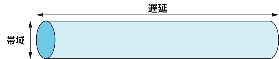 ここまでに議論した二つの指標の積も帯域遅延積 (bandwidth-delay product) と呼ばれる有用な指標となる。 図を使って説明しよう。プロセス間のチャンネルを図 18 のような中空の管 (パイプ) と考えるとき、帯域はパイプの直径に、遅延はパイプの長さに対応する。このとき帯域遅延積はパイプの体積となる ── つまり、ある瞬間に転送状態でいられるデータのビット数を表す。別の言い方をすればこうなる: レイテンシ (秒で表される) がパイプの長さに対応するなら、各ビットの幅 (同じく秒で表される) が与えられればパイプの中に詰められるビットの個数を計算できる。例えば大陸横断チャンネルのレイテンシが片道 50 ms で帯域が 45 Mbps なら、パイプの中に詰められるビットの個数は次のように計算できる: