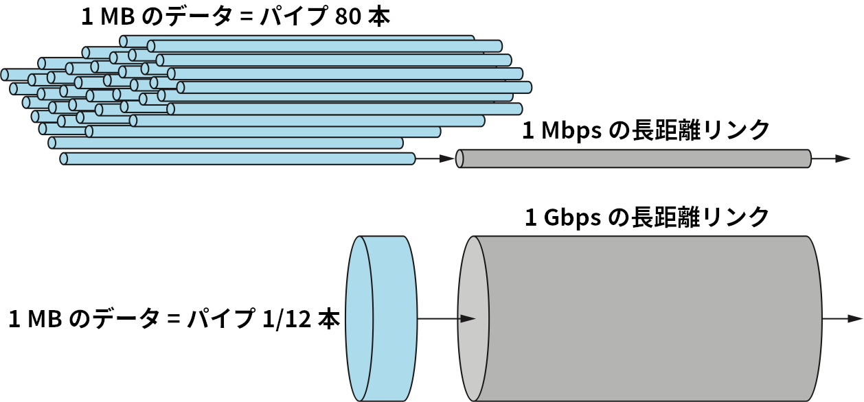 レイテンシが固定された状況で帯域が大きく増加することの意味を理解するために、1 MB のファイルを 1 Mbps のネットワークおよび 1 Gbps のネットワークで転送するときに何が起こるかを考えよう。どちらも RTT は 100 ms とする。1 Mbps のネットワークを使う場合は 1 MB のファイル転送にレイテンシの 80 倍の時間が必要になり、レイテンシごとにファイルの 1.25% が送信される。これに対して、1 Gbps のネットワークにおける 1 MB のファイルは帯域遅延積 12.5 MB のほんの一部でしかない。