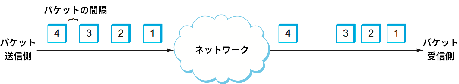 送信側が 33 ms ごとにパケットを一つ送信する状況を考えよう。例えば映像アプリケーションが 1 秒間に 30 フレームを転送するような状況である。もしパケットが正確に 33 ms ごとに受信側へ届くなら、そのネットワークで各パケットの遅延は全く同じだと判断できる。しかし、もしパケットが受信側に届く間隔 ── パケット間ギャップ (inter-packet gap) と呼ばれる ── が変化するなら、「ネットワークはパケットストリームにジッターを加えている」と言う。そういった変動は単一の物理リンクでは通常起きず、マルチホップのパケット交換ネットワークにおけるキュー待ち遅延がパケットごとに異なるために発生する。このキュー待ち遅延は本節の前半で定義したレイテンシの一要素であり、時間と共に変化する。