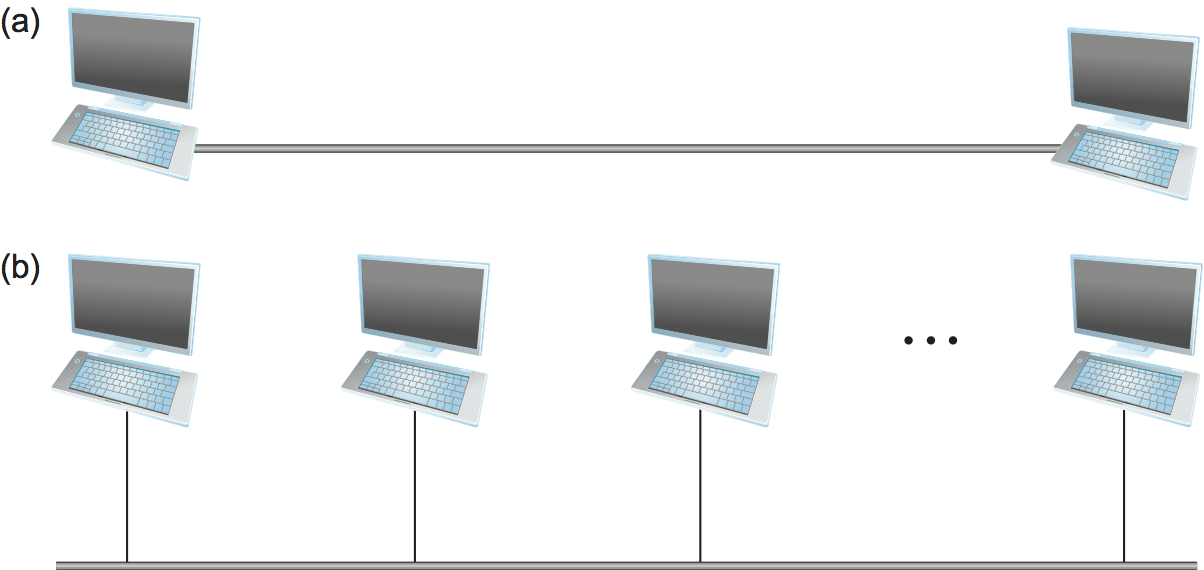 図 2 にあるように、物理リンクが接続できるマシンが二台だけである場合もあれば、単一の物理リンクを三つ以上のマシンが共有する場合もある。前者のようなリンクをポイントツーポイント (point-to-point) と呼び、後者のようなリンクを多元接続 (multiple-access) と呼ぶ。セルラーネットワークや Wi-Fi ネットワークといった無線リンクは多元接続リンクの重要なカテゴリの一つである。多元接続リンクはサイズに必ず制限がある。つまり、多元接続リンクがカバーできる地理的な領域、あるいは多元接続リンクに接続可能なノード数が任意に大きいことはない。これが理由で、ネットワークの残りの部分とエンドユーザーを接続するラストマイル (last mile) の実装に多元接続リンクはよく使われる。