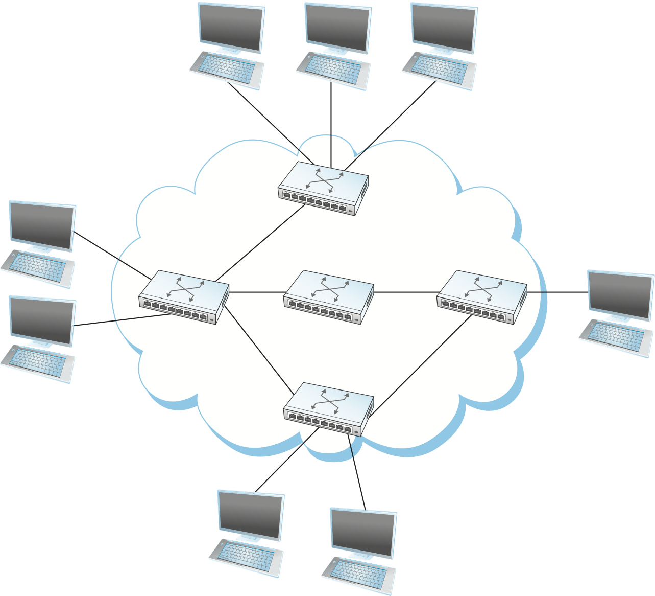 図 3 では、ネットワークを実装するノードとネットワークを利用するノードが区別されている。「雲」の中にあるのがネットワークを実装するノードであり、多くの場合スイッチ (switch) と呼ばれる。スイッチはパケットの蓄積と転送を主な仕事とする。「雲」の外にあるのがネットワークを利用するノードであり、伝統的にホスト (host) と呼ばれる。ホストはユーザーをサポートし、アプリケーションプログラムを実行する。なお、この「雲」はコンピューターネットワークで最も重要なアイコンの一つである。一般に、ネットワーク図で雲は任意のネットワークを表す: 単一のポイントツーポイントリンクであれ交換ネットワークであれ表すことができる。そのためネットワーク図に雲が含まれているときは、本書で触れるネットワーク技術のいずれかを表すプレースホルダーなのだと思えばよい1。