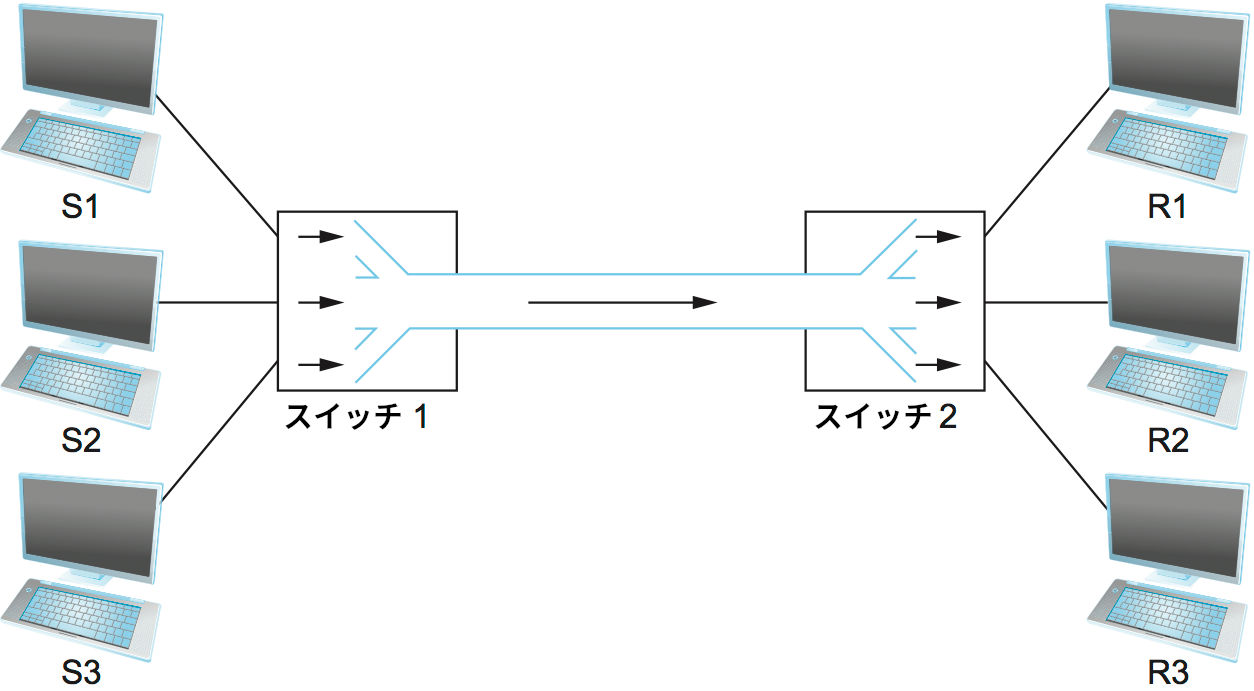 多重化の例として、図 5 に示す簡単なネットワークを考えよう。左にある三つのホスト (送信側 S1, S2, S3) が右にある三つのホスト (受信側 R1, R2, R3) にデータを送っており、物理リンクを一つしか持たない交換ネットワークが共有されている (簡単のため、ホスト S1 はホスト R1 にデータを送っており、同様に S2 は R2 に、 S3 は R3 に送っているとする)。この状況で、三つのホストの組に対応する三つのデータフローはスイッチ 1 によって単一の物理リンクで多重化され、スイッチ 2 によって個別のデータフローに逆多重化 (demultiplexing) される。以降の議論は「データフロー」が何を指すかを意図的に曖昧にしたまま話を進めるので注意してほしい。また議論の都合上、左側の三つのホストはどれも右にあるホストに大量のデータを送ろうとしているとする。