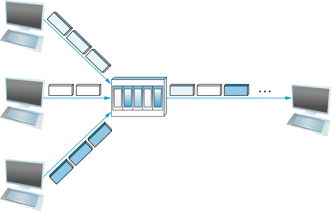 また図 6 において、スイッチが三つのパケットストリームを受け取って一つの外向きの共有リンクでそれらを多重化しなければならないために、スイッチが受け取るデータの量が共有リンクに流せないほど大きくなる可能性があることに注意してほしい。その場合、スイッチは送り切れないパケットをメモリにバッファしなければならない。もし送信できるより多くのパケットを受け取る状況がある程度長く続けば、いずれスイッチはバッファの空間を使い果たし、パケットの一部を破棄しなくてはならなくなる。そういった状態にあるスイッチは輻輳 (congestion) を起こしていると言う。