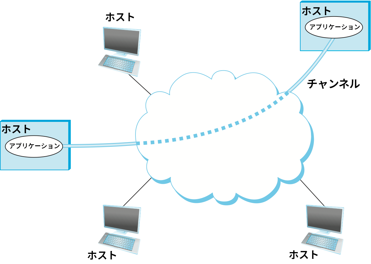 ここでチャンネル (channel) の概念が登場する: 簡単に言えば、アプリケーションが必要とするサービスの集合を提供する論理的なチャンネルをネットワークが提供し、そのチャンネルを通してアプリケーションレベルのプロセスが互いに通信するとみなされる。言い換えれば、「雲」がコンピューター同士の接続を抽象的に表すのと同じように、ここでは「チャンネル」でプロセス同士の接続を表す。図 7 に論理的なチャンネルを通して通信するアプリケーションレベルのプロセスの組を示す。チャンネルはホスト同士を接続する「雲」の上に作られるので、送信を行うアプリケーションはデータをチャンネルに入れるとチャンネルの向こう側のアプリケーションがデータを受け取れると期待できる。