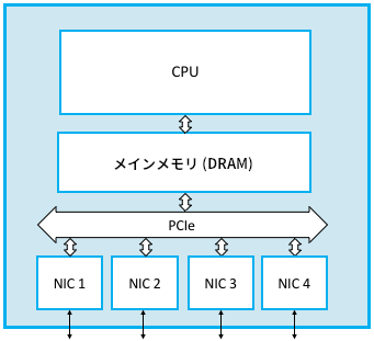 汎用プロセッサに四つの NIC (network interface card, ネットワークインターフェースカード) を搭載して作られたソフトウェアスイッチを図 93 に示す。このスイッチにおいて、例えば NIC 1 に届いた典型的なパケットが NIC 2 に転送される道筋は難しくない: パケットを受け取った NIC 1 は DMA (direct memory access, ダイレクトメモリアクセス) と呼ばれるテクニックで I/O バス (この例では PCIe) 越しにメインメモリへバイトを直接コピーする。パケットがメモリに到着したら、CPU がヘッダーを確認してパケットを送信すべきインターフェースを認識し、NIC 2 にパケットを送信するよう指示を出す。NIC 2 はここでも DMA を使ってメインメモリから直接パケットを送信する。ここで重要なのは、パケットがメインメモリにバッファ (「蓄積転送」における「蓄積」) され、CPU は転送先の判断に必要なヘッダーフィールドだけを内部のレジスタに読み込んで処理を行うことである。