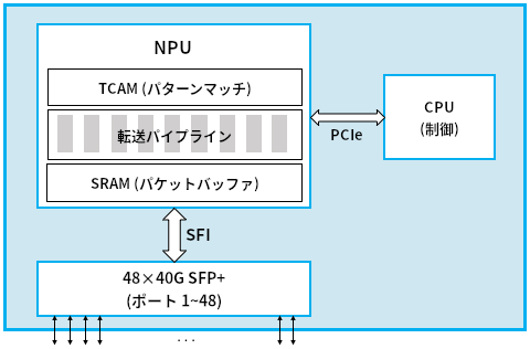 NPU は内部で三つのテクノロジを活用する。第一に、処理中のパケットをバッファするのに高速な SRAM ベースのメモリが利用される。SRAM (static random access memory) はメインメモリとして使われる DRAM (Dynamic Random Access Memory) と比べておよそ十倍高速である。第二に、処理中のパケットとマッチを判定するビットパターンを格納するのに TCAM (ternary content-addressable memory) ベースのメモリが利用される。TCAM の「CAM (content-addressable memory)」は、テーブルを検索するときのキーをアドレスとして使えるメモリを意味する。TCAM の「T (ternary, 三項間)」は、検索のキーにワイルドカードが使えることを意味する (例えばキー 10*1 は 1001 と 1011 の両方にマッチする)。最後に、各パケットの転送に関係する処理は転送パイプラインによって実装される。このパイプラインは ASIC によって実装されるものの、きちんと設計されれば、実行するプログラムを変えることでパイプラインの転送の振る舞いを変更できる。高いレベルで言うと、このプログラムは (マッチ, アクション) という組の集合として表され、「ヘッダーがこのフィールドにマッチしたら、このアクションを実行せよ」という指示を出す。