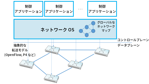 SDN を成功に導いた要素の一つに NOS (Network Operating System, ネットワークオペレーティングシステム) がある。サーバーのオペレーティングシステム (Linux, iOS, Android, Windows など) がアプリケーションの実装を容易にするための高レベルの抽象化を提供する (例えばファイルの読み書きでディスクドライブに直接アクセスする必要はない) のと同じように、NOS はネットワークを制御する機能の実装を容易にする。ネットワークを制御する機能を実装するソフトウェアを制御アプリケーション (control app) と呼ぶ場合がある。NOS がネットワーク状態の収集 (リンク状態型あるいは距離ベクトル型の分散ルーティングアルゴリズムで難易度の高い部分) などの処理を行うので、制御アプリケーションは最短路アルゴリズムの実行や内部のスイッチに転送ルールを読み込ませる処理の実装に集中できる。こうしてロジックを中央集権化することで、グローバルに最適化されたソリューションが生まれることが期待されている。クラウドプロバイダが公開している資料によると、彼らは中央集権的なアプローチにこの利点があることを確認したようである。