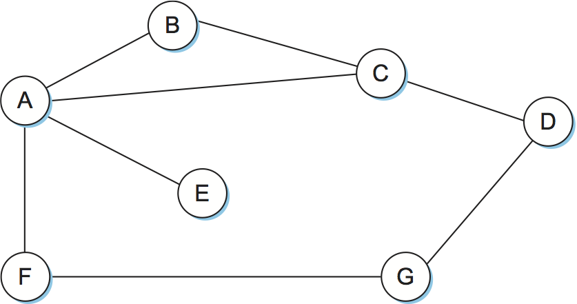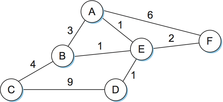 これから本節では図 84 のネットワーク (グラフ) を例として使っていく。このグラフは単一のコストが割り当てられた無向の辺を持っているが、これは小さな単純化と言えることに注意してほしい。辺を有向にして、接続されているノードの間に両方向の辺を張ってそれぞれの方向でコストが異なるようにした方が正確になる。