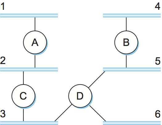 ルーティングにおける基礎的な問題は、任意の頂点の組に対してそれらを結ぶ路の中でコストが最小のもの (最小コスト路) を見つける問題である。ここで路のコストは路に含まれる辺のコストの和に等しい。図 84 のような単純なネットワークでは、全ての最小コスト路を計算して各ノードの不揮発性ストレージに保存しておく方法が考えられる。そういった静的なアプローチにはいくつか欠点がある: