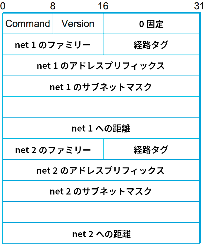 この事実は図 87 に示した RIP Version 2 (RIPv2) のパケットフォーマットからも確認できる。パケットの大部分は (アドレス, マスク, 距離) の三つ組で占められている。しかし、ルーティングアルゴリズムの基本的な考え方は変わらない。例えばルーター A が「ネットワーク X に到達するには、現在ルーティングテーブルに記されたネクストホップよりも B を通った方が少ないホップで済む」と学習したなら、A はネットワーク X に対するコストとネクストホップの情報を適切に更新する。