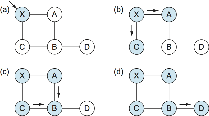 図 88 に小規模なネットワークにおける LSP のフラッディングの例を示す。新しい LSP を保存したノードが水色で示されている。最初 LSP はノード X に到着し (a)、X は隣接する A と C に LSP を送る (b)。A と C は LSP を送ってきたノード X には LSP を送り返さず、B だけに送る (c)。B は同一の LSP を A と C から受け取るので、最初に到着した方を保存し、後に到着した方を破棄する。その後 B は LSP を D に送信する。D は LSP を送信すべき隣接ノードを持たないので、フラッディングはここで完了する。