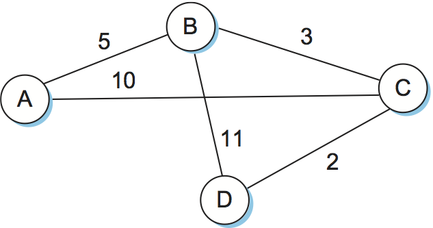 例を見れば理解がずっと簡単になるだろう。図 89 に示すネットワークを考える。一つ前の例と異なり、今回は各辺が異なるコストを持つ。ノード D におけるルーティングテーブル構築の各ステップを表 20 に示す。D の二つの出力先を結ばれているノードの名前 (B と C) で表記している。アルゴリズムは間違った経路 (B に直接到達するコスト 11 の経路など) を選びかけることがあるものの、最終的には全てのノードに対する最小コスト路を計算できている点に注目してほしい。