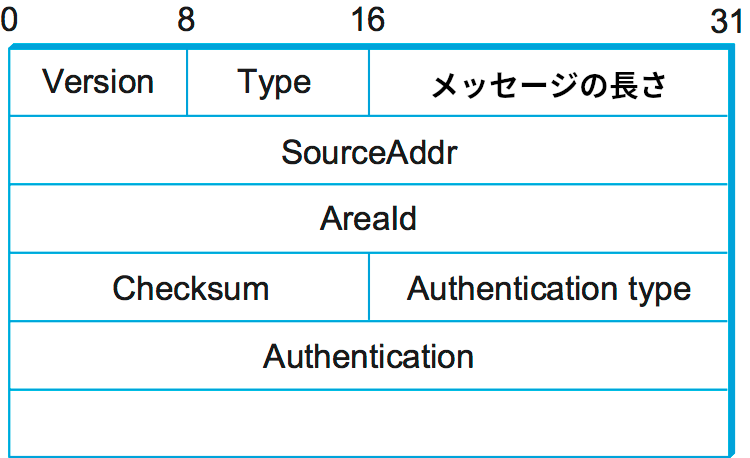 OSPF メッセージにはいくつか異なる種類が存在するものの、先頭のヘッダー (図 90) は共通している。Version フィールドは現在 2 で固定であり、Type フィールドは 1 から 5 の値を取る。SourceAddr フィールドはメッセージの送信元を識別し、AreaId フィールドは送信元ノードが属するエリアを表す 32 ビットの識別子である。認証データを除くパケット全体は IP ヘッダーと同様のアルゴリズムを用いる 16 ビットのチェックサムで保護される。Authentication type フィールドには認証を使わないなら 0、単純なパスワードを用いるなら 1、暗号チェックサム認証を用いるなら 2 を設定する。認証を用いるときは、Authentication フィールドにパスワードあるいは暗号チェックサムを設定する。