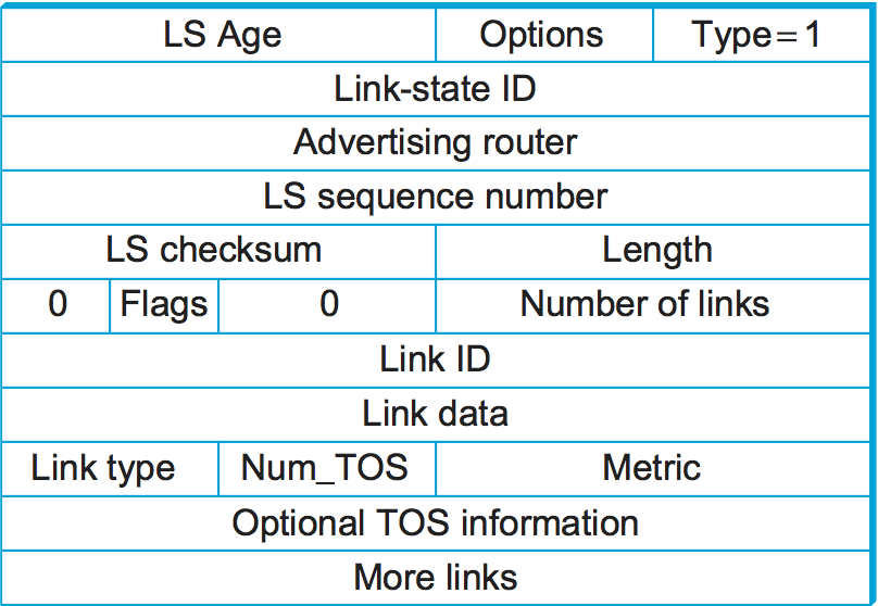 図 91 にタイプ 1 のリンク状態広報で使われるパケットのフォーマットを示す。タイプ 1 の LSA はルーター同士を結ぶリンクのコストを広報する。タイプ 2 の LSA はルーターが自身の接続するネットワークを広報するために利用され、他のタイプは先述した追加の階層構造をサポートするために利用される。LSA のフィールドの多くはこれまでの議論から明らかなはずである。LS Age フィールドは基本的に TTL (time to live) のことだが、このフィールドは時間が経過すると大きくなっていき、事前に定義された最大値になったときに LSA が期限切れとなる点が通常の TTL と異なる。Type フィールドはこれがタイプ 1 の LSA であることを示す。