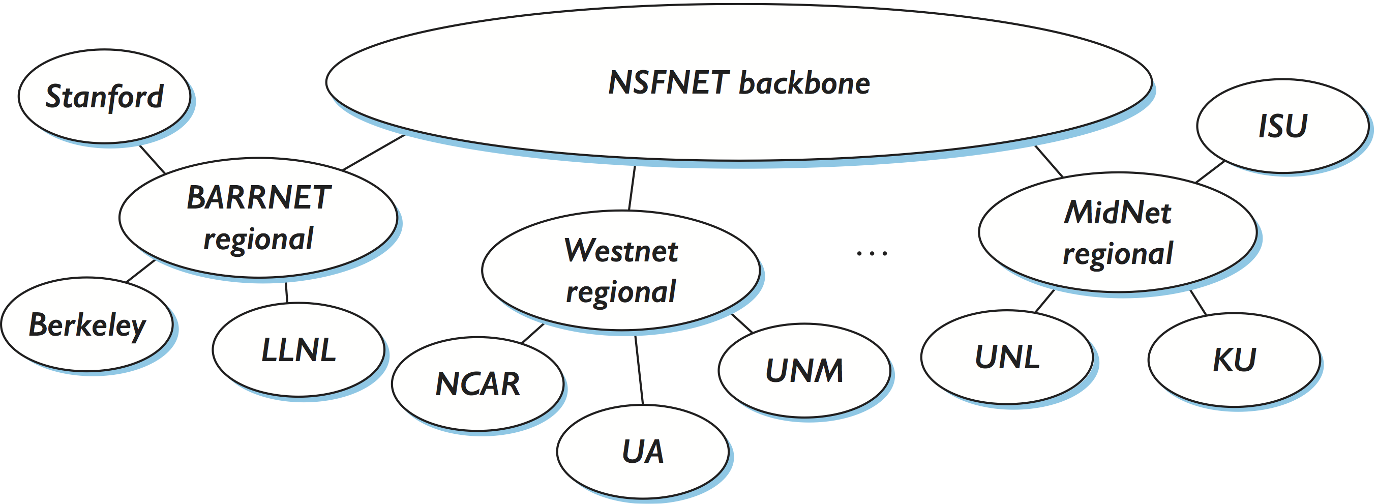 このトポロジーの重要な特徴が、それぞれのエンドユーザー拠点がプロバイダネットワークに接続することである。例えばスタンフォード大学の拠点はサンフランシスコ州ベイエリア内の拠点にサービスを提供するプロバイダネットワーク BARRNET に接続する。1990 年ごろ、プロバイダが提供するネットワークは多くが地理的な制限を持っていたので、地域ネットワーク (regional network) と呼ばれていた。地域ネットワークはさらに全国規模のバックボーンへと接続される。1990 年に使われていたバックボーンは NSF (National Science Foundation, アメリカ国立科学財団) が設立したものであり、そのため NSFNET バックボーン (NSFNET backbone) と呼ばれた。