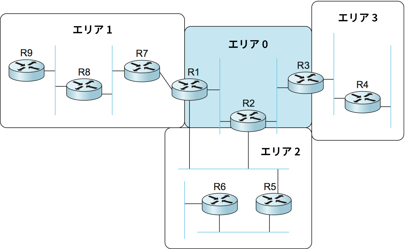 エリアとはリンク状態に関する情報を交換し合うよう管理者によって設定されたルーターの集合を言う。特別なエリアとしてバックボーンエリア (backbone area) またはエリア 0 (area 0) と呼ばれるエリアが存在する。いくつかのエリアに分割されたルーティングドメインの例を図 98 に示す。ルーター R1, R2, R3 はバックボーンエリアに属しており、同時に (少なくとも一つの) 非バックボーンエリアのメンバーでもある。例えば R1 はエリア 1 とエリア 2 の両方に属している。バックボーンエリアと非バックボーンエリアの両方に属するルーターを ABR (area border router, エリア境界ルーター) と呼ぶ。AS の境界にあるルーターは ABR と呼ばないので注意する必要がある。そういったルーターは AS 境界ルーター (AS border router) と呼んで区別する。