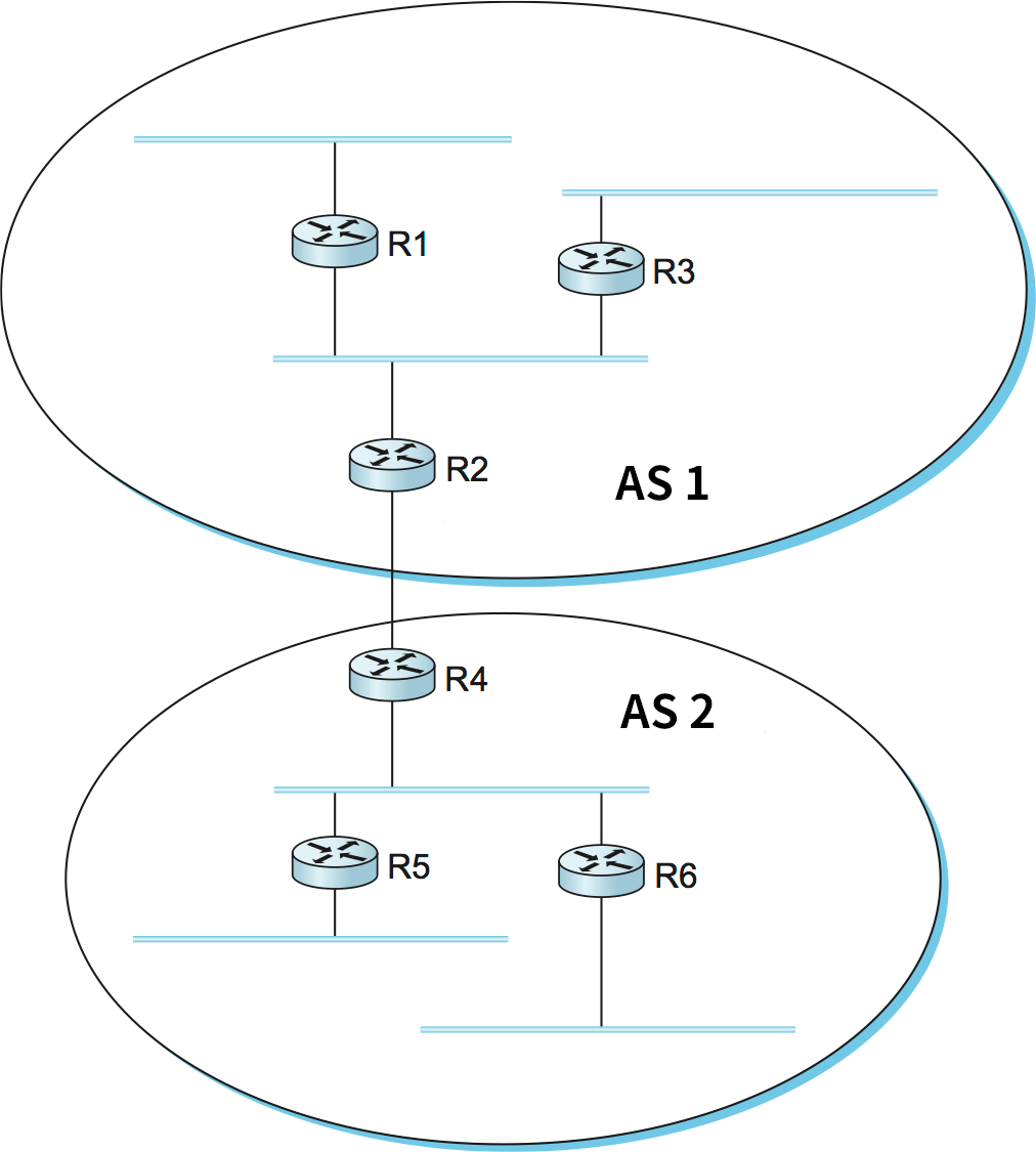 各 AS は他の AS とパケットをやり取りする境界ルーター (border router) を一つ以上持つ。図 99 の例では R2 と R4 が境界ルーターである。境界ルーターとは単に AS の間でパケットを転送するタスクを課された IP ルーターのことを言う。