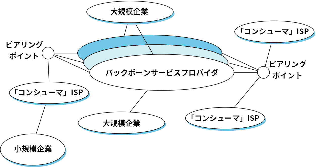 NSFNET は後に Internet2 という組織が生まれるきっかけとなった。Internet2 は現在でも米国の研究教育機関のためのバックボーンを運営している。しかし当然、多くの人々はインターネットへの接続を商用プロバイダから購入する。この図に詳細は描かれていないものの、現在のインターネットで Tier 1 と呼ばれる最も大規模なプロバイダネットワークは、主要都市エリア (口語で「NFL 都市」と呼ばれる) に配置された数十個のハイエンドルーターをポイントツーポイントリンク (通常それぞれ 100 Gbps) で接続して構築される。同様に、それぞれのエンドユーザー拠点は単一のネットワークではなく、スイッチとルーターで相互接続された複数の物理ネットワークから構成される場合が多い。