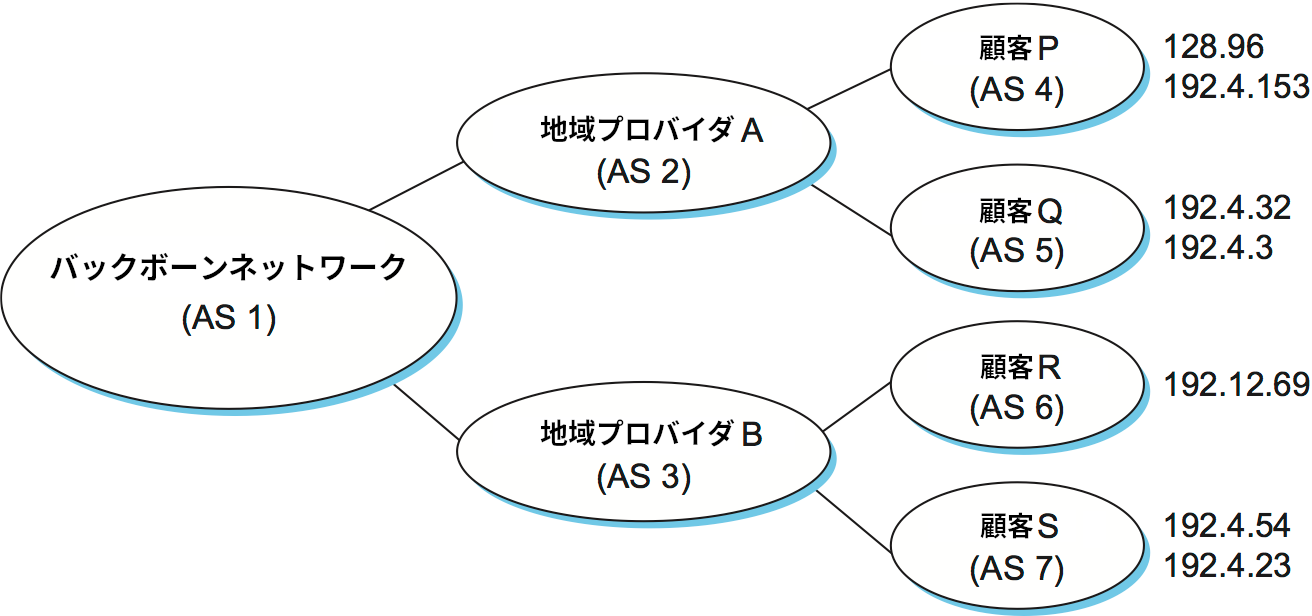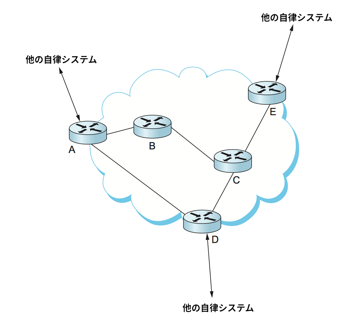 それぞれのプロバイダとエンドユーザー拠点はお互いに独立した管理主体である可能性が高いことに注目してほしい。この事実はルーティングに大きな影響を及ぼす。例えば、最も優れたルーティングプロトコルやリンクに割り当てるべきメトリックに関して異なるプロバイダが異なる見解を持つ可能性は非常に高い。こういった独立性を持つために、それぞれのプロバイダが運営するネットワークは単一の AS (autonomous system, 自律システム) であると言われる。この単語の意味は以降の節で正確に定義するが、今のところは他のネットワークと独立して管理されるネットワークが AS だと考えておけば十分である。