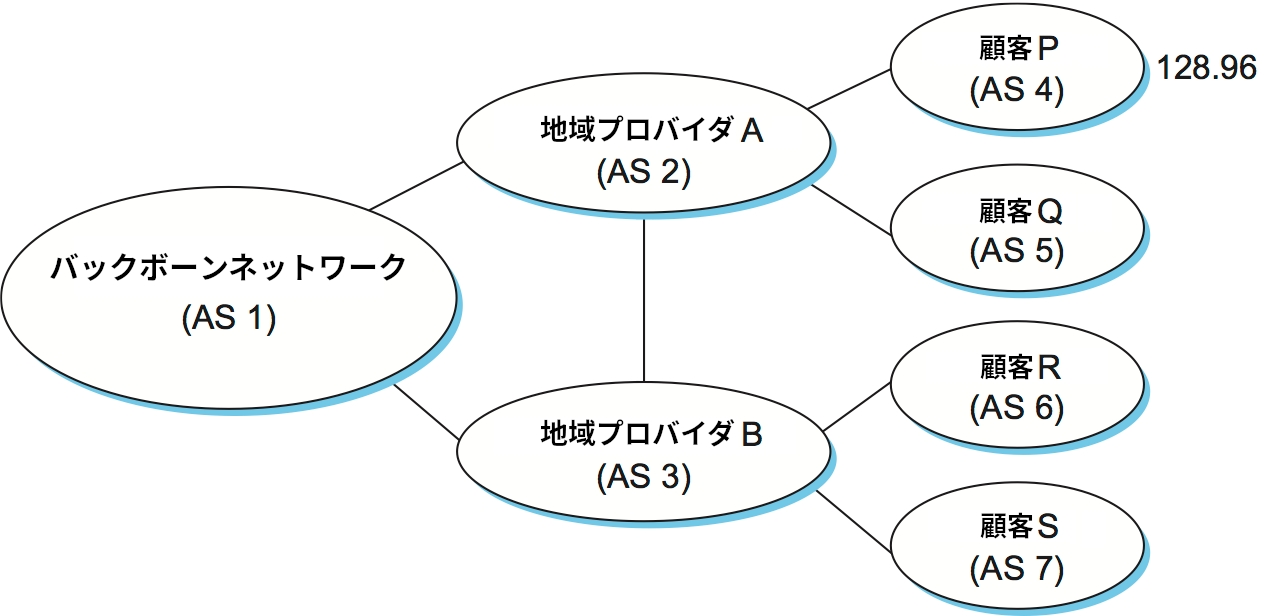 BGP の動作を見るために、図 101 に示す非常に単純なネットワークを考えよう。中央にあるプロバイダの AS はトランジット AS で、右端にある顧客の AS はスタブ AS だとする。プロバイダ A が保有する AS 2 の BGP スピーカーは顧客 P, Q に対して割り当てたネットワーク番号に対する到達可能性を広報できる。このため、AS 2 は「ネットワーク 128.96, 192.4.153, 192.4.32, 192.4.3 には AS2 から直接到達できる」と記した広報を送信する。続いて、この広報を受け取ったバックボーンネットワーク (AS 1) は「ネットワーク 128.96, 192.4.153, 192.4.32, 192.4.3 には路 (AS 1, AS 2) を通じて到達できる」と記した広報を送信する。プロバイダ B が保有する AS 3 でも同様の処理が起こり、AS 1 は「ネットワーク 192.12.69, 192.4.54, 192.4.23 には路 (AS 1, AS 3) を通じて到達できる」と記した広報を送信する。