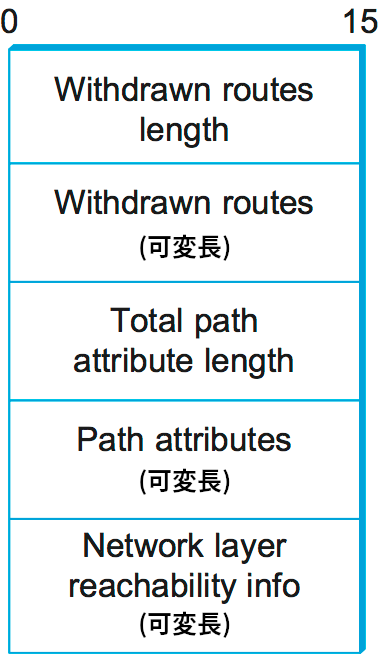 リンクの障害やポリシーの変更は避けられないので、BGP スピーカーは以前に広報した経路をキャンセルできる必要がある。これは経路破棄 (withdrawn route) と呼ばれる否定的な広報によって行われる。肯定的な広報と否定的な広報はどちらも図 103 に示すフォーマットを持つ BGP 更新メッセージで伝達される (本章で登場する他のパケットフォーマットと異なり、この図に示される各フィールドの長さは 16 ビットの倍数である点に注意してほしい)。