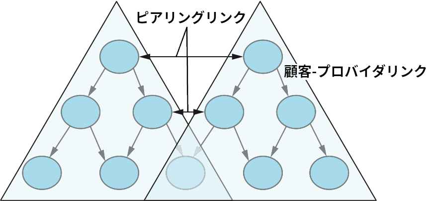 図 104 を観察すると、一見すると構造を持たないインターネットに一定の構造がもたらされているのが分かる。この階層で最下層にあるのはプロバイダの顧客 (の顧客の顧客...) のスタブ AS であり、その上には他のプロバイダを顧客とするプロバイダの AS が存在する。頂点には顧客を持つものの自身は顧客でないプロバイダが存在する。こういったプロバイダは Tier 1 プロバイダと呼ばれる。