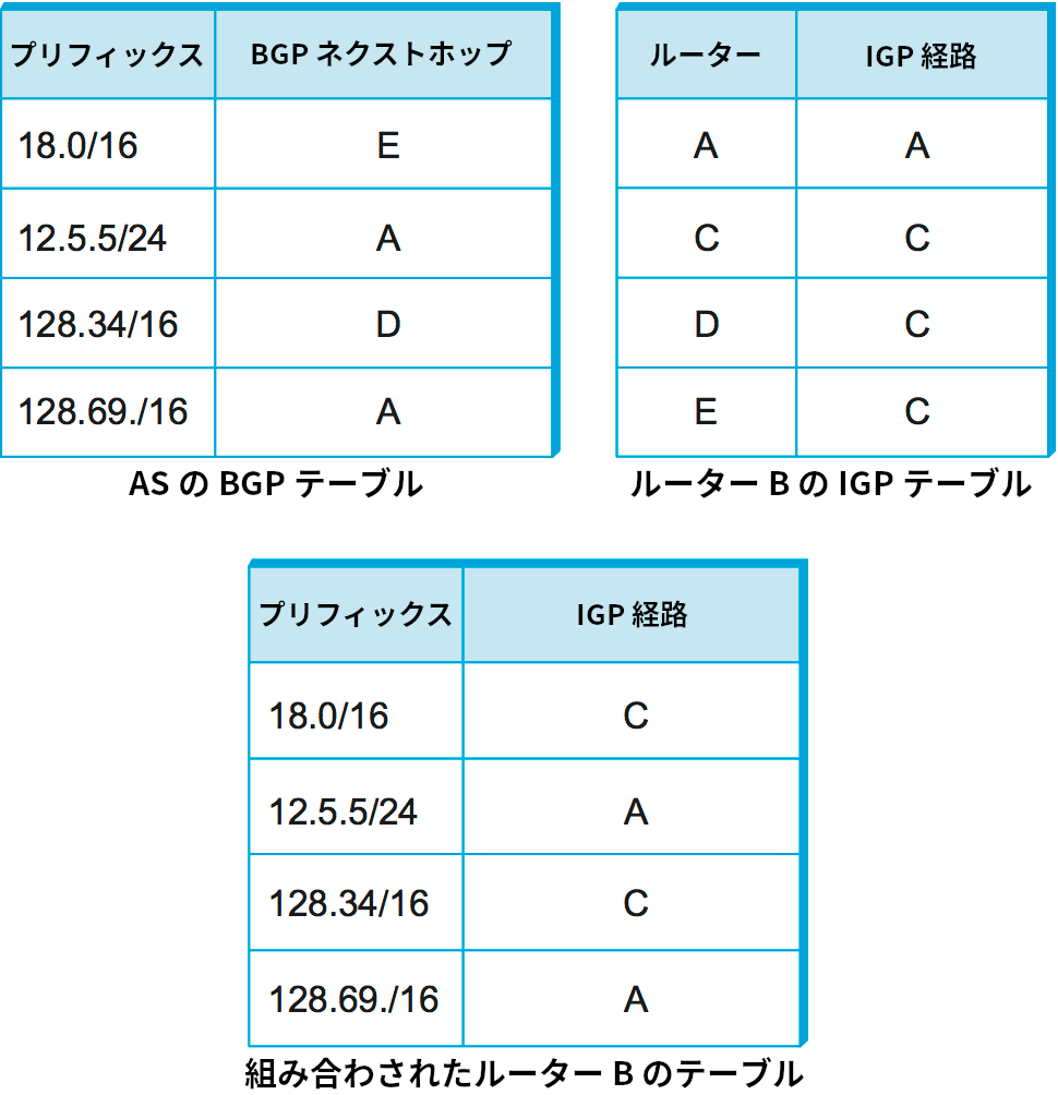 これからルーター B に注目して、B が任意のプレフィックスに宛てられたパケットを転送する完全な方法をどのように理解するかを見ていく。ルーター B が iBGP セッションから学習する情報 (の一例) を図 106 の左上に示す。宛先のプレフィックスごとに、境界ルーター A, B, E のどれにパケットを転送すべきかが示されている。iBGP を実行するのと同時に、AS 内の全てのルーターは何らかのドメイン間ルーティングプロトコル (例えば RIP や OSPF) を実行する。ドメイン内ルーティングプロトコルは一般に IGP (Interior Gateway Protocol, 内部ゲートウェイプロトコル) と呼ばれる。B は自身のドメインの内側に存在するノードに到達する方法を IGP から学習する (図 106 右上)。例えばパケットをルーター E に到達させたいときは、B はパケットをルーター C に転送する。最後に、B は iBGP から学習した外部プレフィックスに関する情報と IGP から学習した境界ルーターへの内部経路の情報を組み合わせ、転送の全体図 (図 106 下) を完成させる。例えばプレフィックス 18.0/16 は境界ルーター E を通じて到達可能であり、E へ到達する最良の内部経路は C を通じたものだと B は知っているから、18.0/16 に宛てられたパケットは C に転送すべきだと分かる。以上の仕組みにより、AS 内の全てのルーターは AS の境界ルーターを通して到達可能な任意のプレフィックスに対応する完全なルーティングテーブルを構築できる。