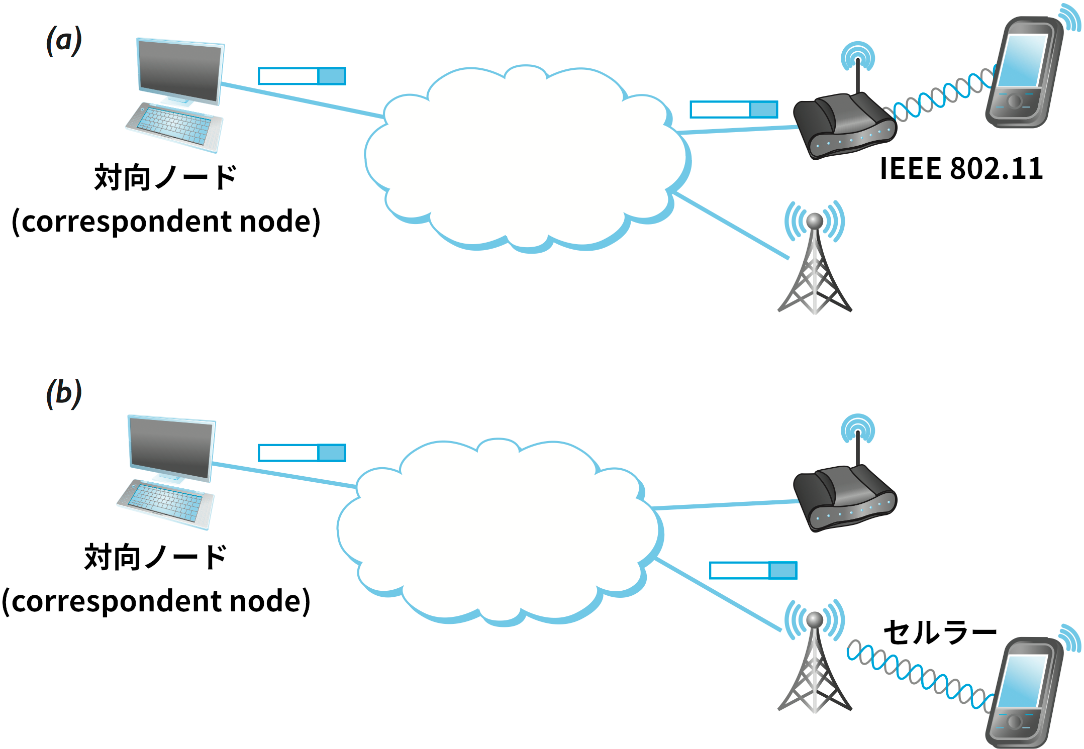 ユーザーが移動して別のネットワークに加わるとき、新しい IP アドレス (新しいネットワークにおける IP アドレス) をユーザーのデバイスに割り当てる必要が明らかにある。しかし、通信相手のコンピューターまたは電話はユーザーが移動したこと、および新しい IP アドレスの値をすぐには認識できない。そのため、特別な仕組みを用意しなければ、通信相手はパケットを新しい IP アドレスではなく以前の IP アドレスに送信し続ける。この問題を図 122 に示す。この図では右にあるモバイルノード (mobile node) が 802.11 ネットワークからセルラーネットワークに移動しており、このとき左にある対向ノード (correspondent node) からのパケットを新しいネットワークに移動したモバイルノードに届ける仕組みが必要になる。この問題を解決する方法は数多く存在する。本節では、そのいくつかを紹介する。