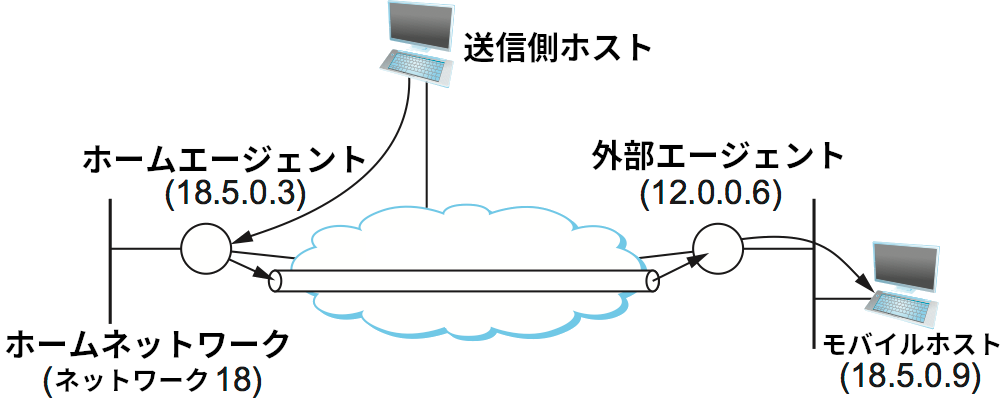 次に、本節で焦点を当てるのはネットワーク層におけるモビリティである。つまり、あるネットワークから別のネットワークに移動するノードに関する問題を考える。同じ IEEE 802.11 ネットワークに属する二つのアクセスポイントの間を移動するノードは IEEE 802.11 特有の仕組みによって対処され、セルラーネットワークも同様の仕組みを持つ。しかしインターネットのような大規模で不均一なシステムでは、ネットワークをまたいだモビリティのサポートが必要となる。