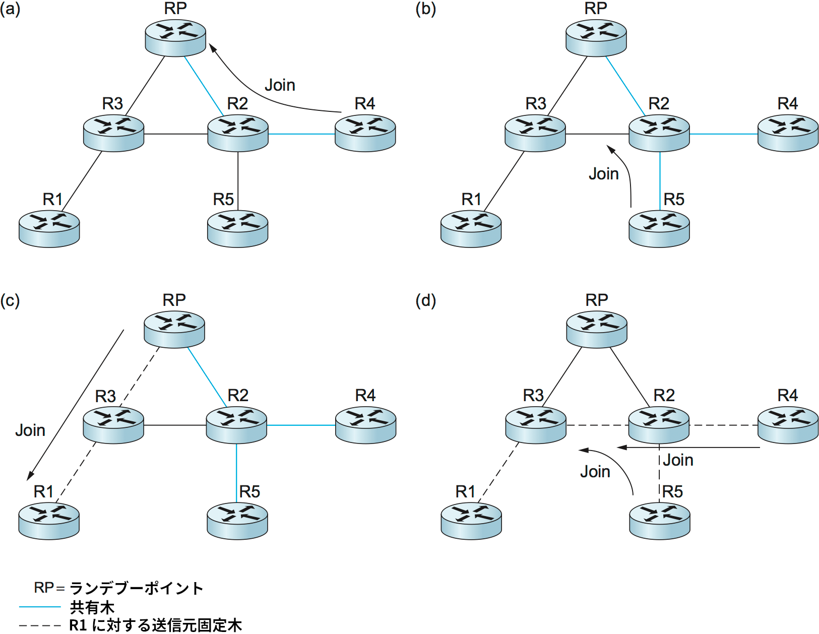 Join メッセージを RP に送り、共有木に参加する; (b) R5 が共有木に参加する; (c) RP が R1 に Join メッセージを送ることで R1 に対する送信元固定木を構築する; (d) R4 と R5 が R1 に Join を送ることで R1 に対する送信元固定木を作成する