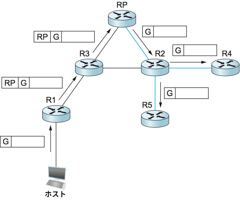 このようにして、 G に宛てられたマルチキャストパケットは最初 RP のユニキャストアドレスを宛先とする追加の IP ヘッダーが付けられて R1 から RP までトンネルされ、それから元のマルチキャストパケットが共有木に沿って R4 および R5 まで配達される。