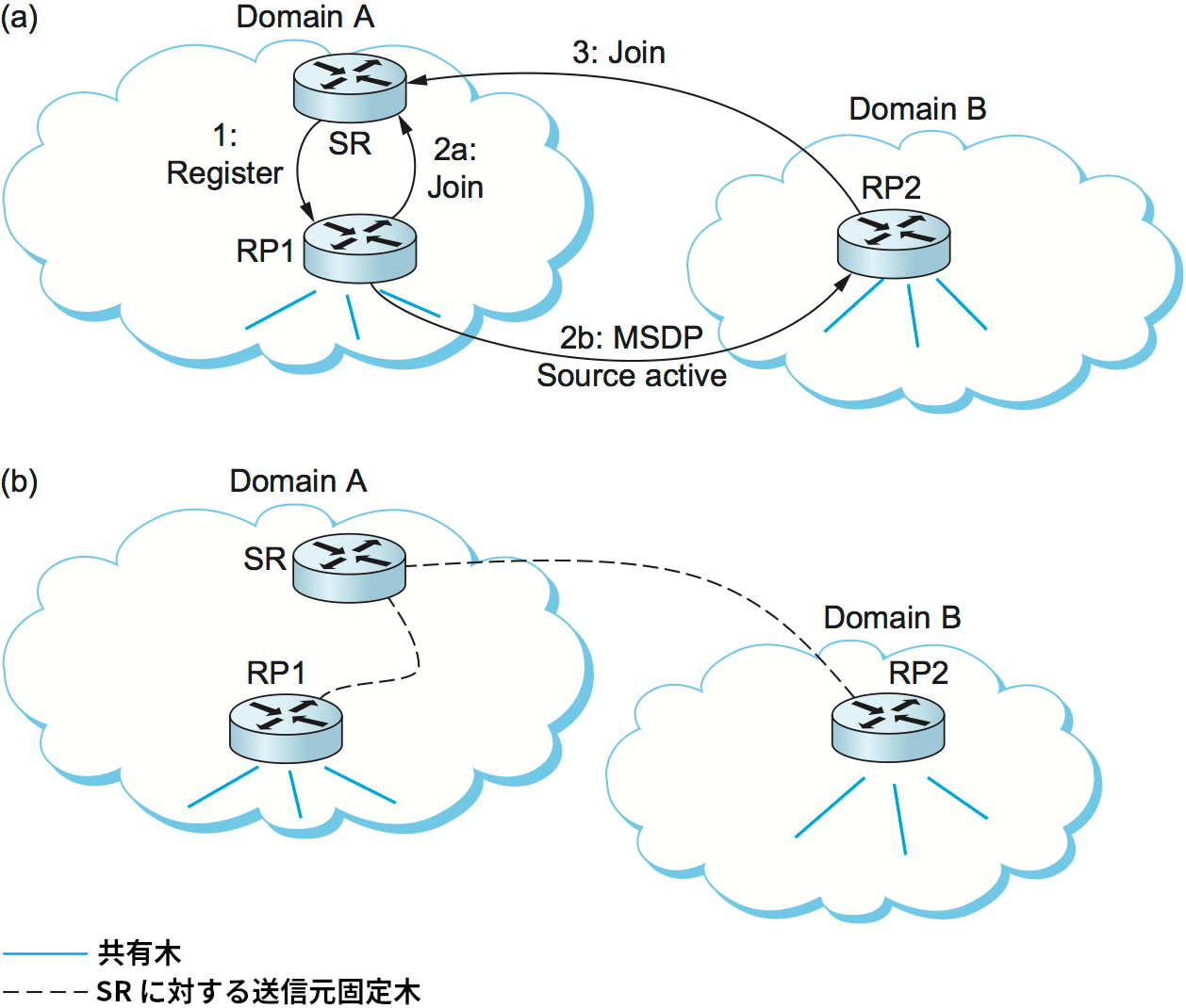 Register メッセージを自身のドメインの RP RP1 に送信する; RP1 は送信元固定の Join メッセージを SR に送信し、MSDP の Source Active メッセージをドメイン B に属する自身の MSDP ピア RP 2 に送信する; その後 RP2 は送信元固定の Join メッセージを SR に送信する (b) この結果として、RP1 と RP2 は送信元 SR を根とする送信元固定木の一部となる。