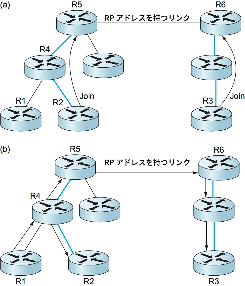 図 110 に示した例を考えよう。最初ルーター R4 がグループ G に対する Join メッセージを RP に送信したとする。ここでは通常の IP ユニキャスト転送が使われる。最初の Join は「ワイルドカード」であり、RP に到達するまでに通過する全てのルーター (この例では R2) も共有木に加わる。具体的には、Join の送信元および Join を確認した途中のルーターは転送テーブルに (*, G) エントリーと呼ばれる共有木用のエントリーを作成する (* は「全ての送信元」を表す)。経路上のルーター (R2) は (*, G) エントリーを転送テーブルに追加するとき、Join を受け取ったインターフェースを G に対するパケットを転送すべきインターフェースとして記録する。さらに、Join を RP に向けて転送するときに使うべきインターフェースを決定し、そのインターフェースを G 宛てのトラフィックを受け取る唯一のインターフェースとして記録する。その後 Join は RP に転送される。こうして RP は Join を受け取り、木の枝の構築が完了する。図 110 (a) 中の青い実線が構築された共有木を表す。
